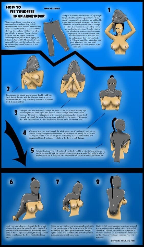 Но даже в нём есть небольшой нюанс. На первый взгляд, освободиться из данного положения немногим сложнее, чем оказаться в нём. Однако это зависит от ширины штанов. Если они окажутся слишком узкими, наподобие леггинсов, то твои локти окажутся скованы и ты уже не сможешь самостоятельно освободиться.